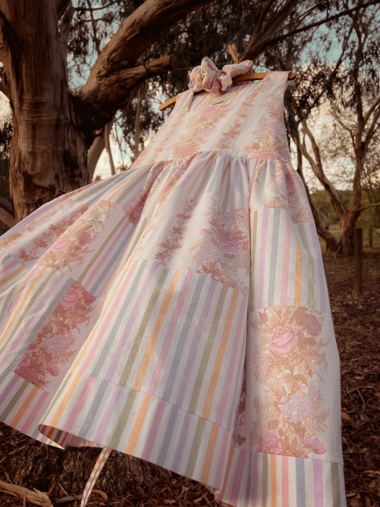 Vintage textiles that move like a sweet melody. This listing is for a ready made 'Meadow Lark' patchwork mini dress handcrafted from 100% vintage textiles. A timeless romantic silhouette, voluminous, with a hem line that is 3 metres long, this design layers beautifully in the colder months and includes pockets.